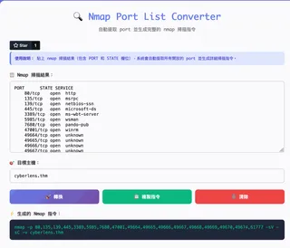 這是我開發的一個輕量級 Web 工具,旨在將複雜的 Nmap 指令行字串,轉換為人類可讀的格式,或是將結構化的參數組合成可執行的指令。